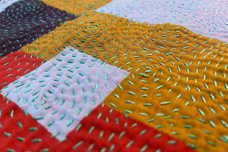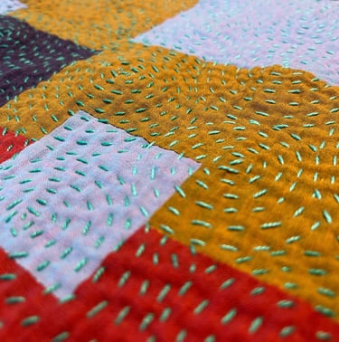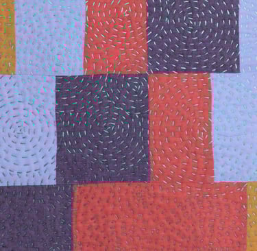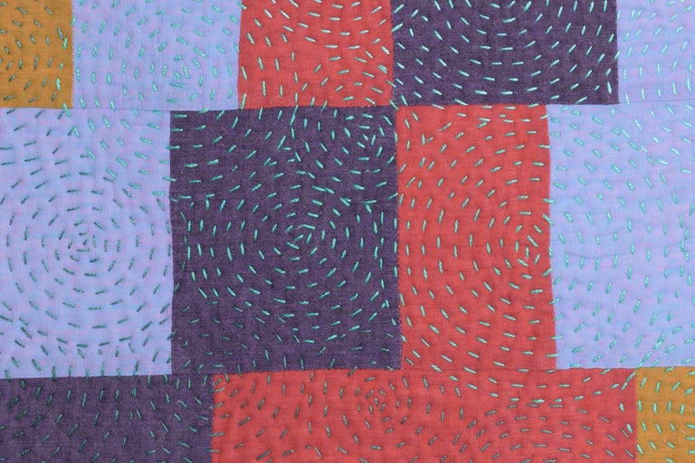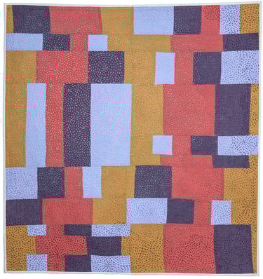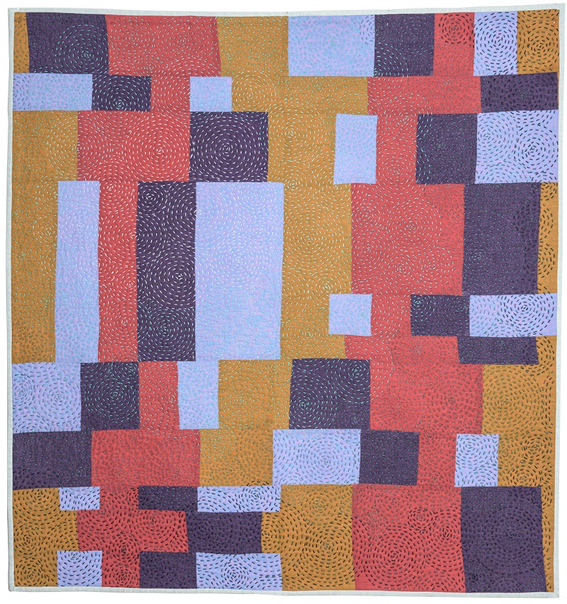 This quilt is improvisationally pieced with four fabrics selected to create a value progression. When quilting, I began with the lightest teal in the top left quadrant and changed to darker threads as I moved out creating a focal point for the quilt. The spirals remind me of airflow patterns over a pixelated landscape.