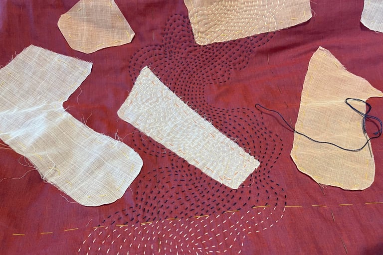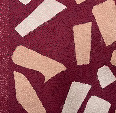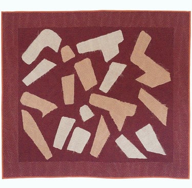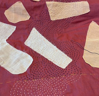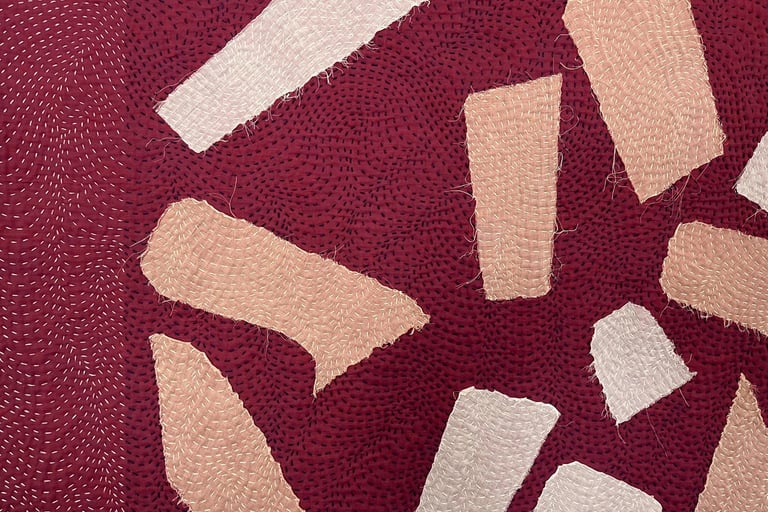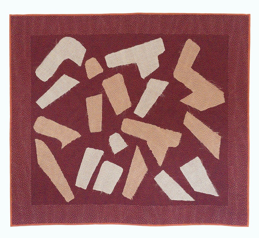 I cut the Hebrew letters from a semi-sheer fabric and layered them on top of a single piece of wine-colored fabric. I then improvisationally handstitched the whole piece in three different colors of thread, deliberately fraying the letters’ fabric and creating meandering lines that echo the paths of people’s lives.