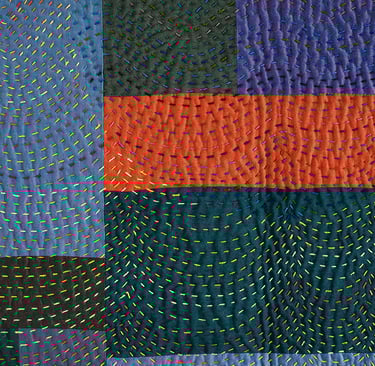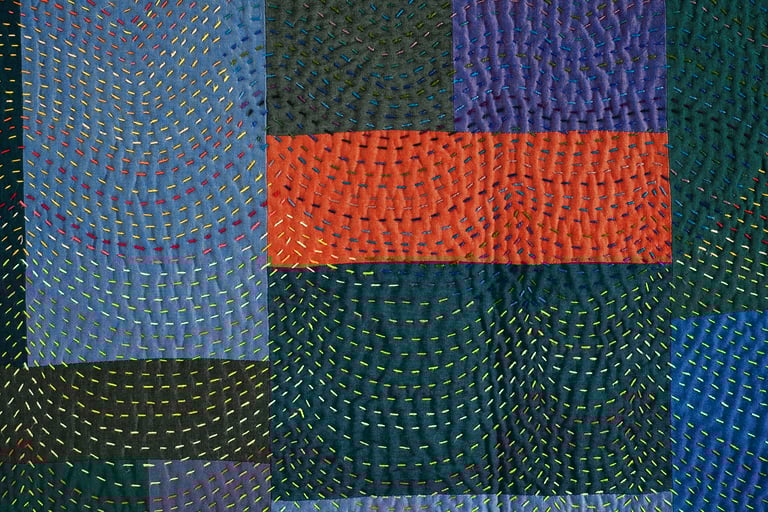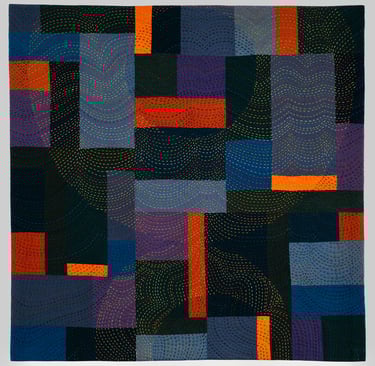 This is the first quilt I made after recovering from a shoulder injury. The top is improvisationally pieced using mostly shot cottons. The stitching is freehand, although I marked out the two circular figures to know where to switch thread from cool to warm hues. The title, Teshuvah, means return in Hebrew, celebrating my ability to return to sewing. As I stitched, and the two circular figures emerged, I sometimes imagined them as beings floating through space together, perhaps returning to someplace they love.