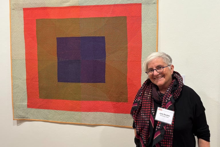 My textile art explores the emotional impact of color, line, and shape. I delight in creating abstract images from the repetition of stitches of thread or scraps of fabric. I like that these materials are accessible and carry associations of daily life but can be transformed into unexpected and evocative pieces of art. I hope my viewers have a visceral reaction to my work, responding in ways I might not anticipate.