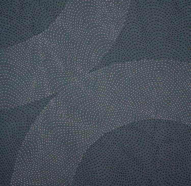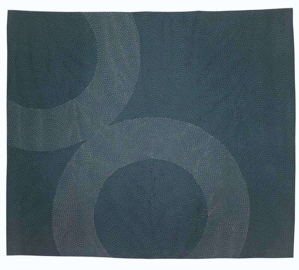 This is the first in a series of quilts that explore connection, disconnection, intersection and immersion. These whole cloth quilts feature curved figures created with different colors of thread. In this quilt, two partial circles connect, bumping against one another. The image is created by switching from black thread in the background to a pale pink in the circular figures creating high contrast on dark fabric.