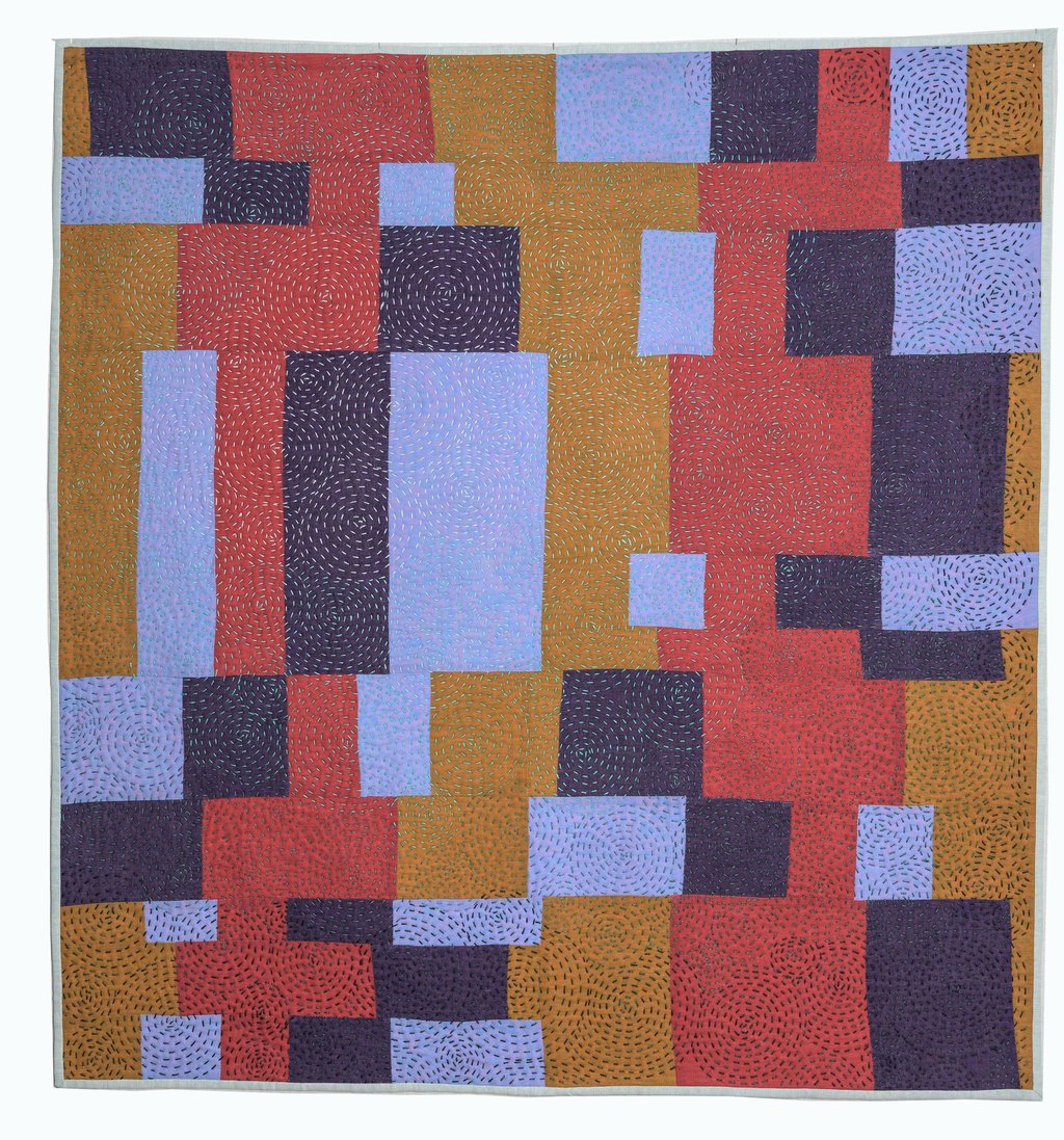 Hiking one Autumn morning, I saw a tree stump covered in lichen that fanned out in circles of different shades of green. As I quilted the spirals, I remembered that tree trunk. This quilt is improvisationally pieced with four fabrics selected to create a value progression. When quilting, I began with the lightest teal in the top left quadrant and changed to darker threads as I moved out creating a focal point for the quilt.