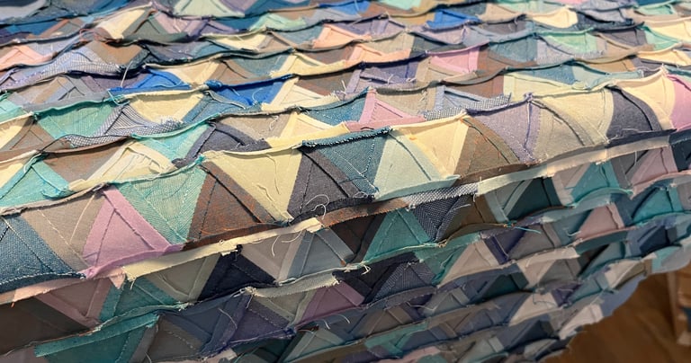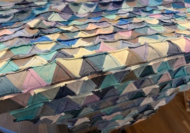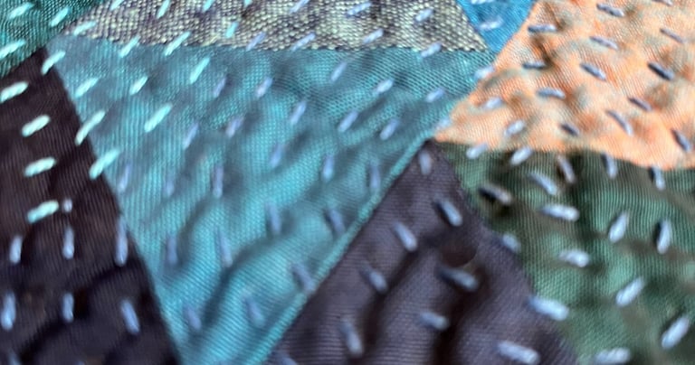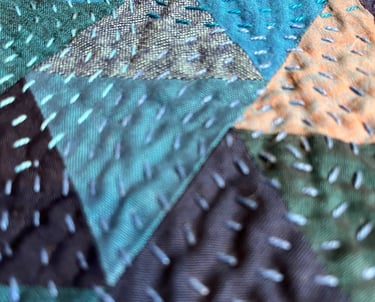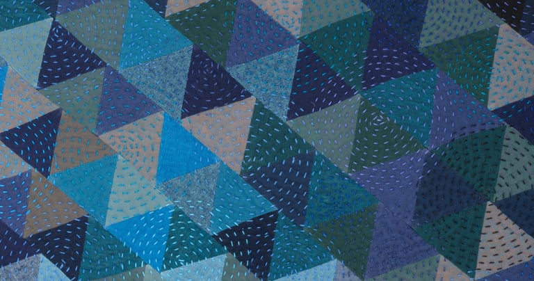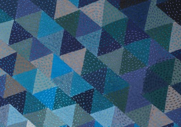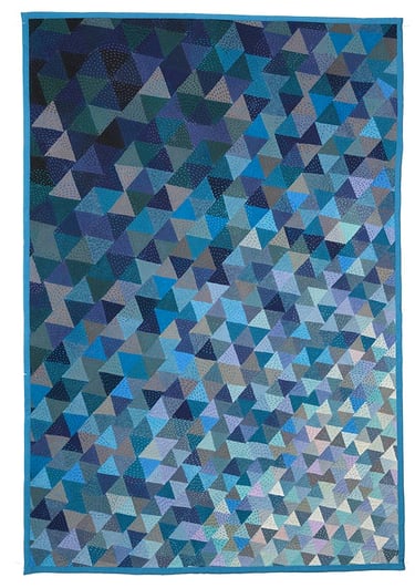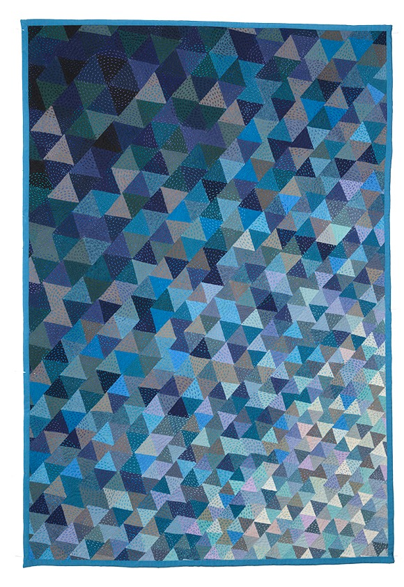 My Pacific is made from many equilateral triangles in different shades of blue fabrics, sewn in strips. The strips are sewn together on a diagonal, with the size of the triangles and the value of the blues increasing as the move from the right bottom corner to the top left corner. It is covered in free hand stitched spirals, also in many shades of blue perle cotton thread. It has wool batting and cotton backing.