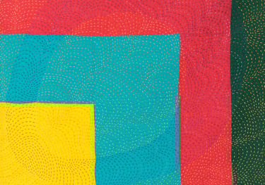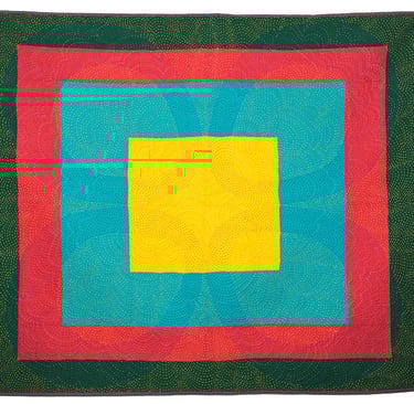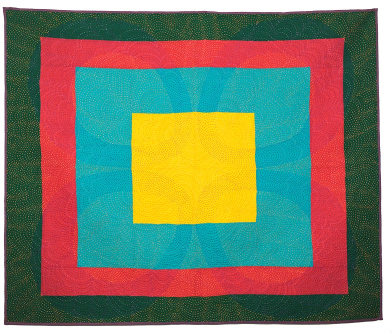 I love how evocative oval shapes are. They suggest eggs and eyes and flower petals and so much more. In this quilt, I superimposed four large hollow ovals on the top of the quilt by changing the color of thread from different shades of orange in the background to different shades of purple in the body of the ovals. This is part of a series of four-color quilts that use intensive hand stitching to create secondary designs that interact with the fabric below. In this quilt, I tried several new things: using the lightest value fabric at the center and moving progressively darker, quilting in a circular fashion rather than edge to edge and creating more texture by using different values of the two thread colors.